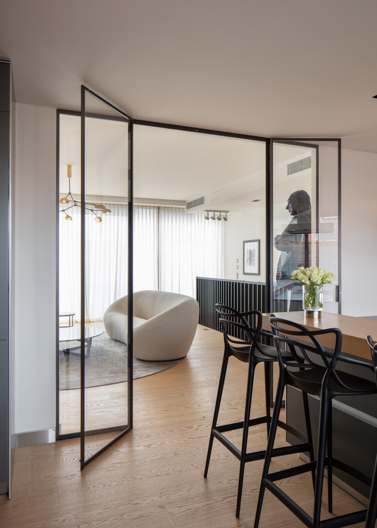 La cuisine est râblée, essentiellement fonctionnalisée par des agencements Bulthaupt, et l'ilôt central cerné des chaises Masters de Philippe Starck pour Kartell – un condensé d'icônes du design compilant la Série 7 d'Arne Jacobsen, la Tulip de Saarinen et la chaise Eiffel des Eames. Si ce rez supérieur est plus serviciel, il est aussi l'espace de réception par excellence. Des voilages intimisent et privatisent l'étage côté cour, quand des baies vitrées offrent transparence et ouverture sur l'extérieur.